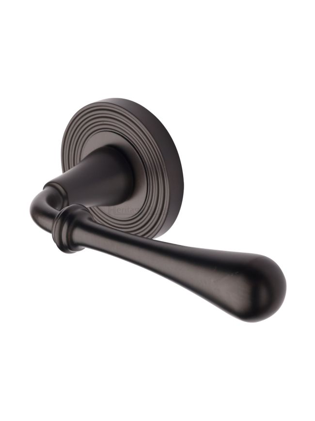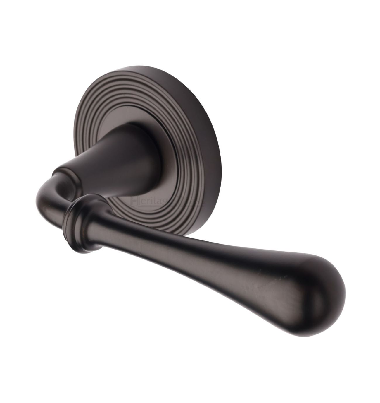 Heritage Brass Door Handle Lever Latch on Round Rose Roma Reeded Design Matt Bronze finish UK Registered Design Number 6226296