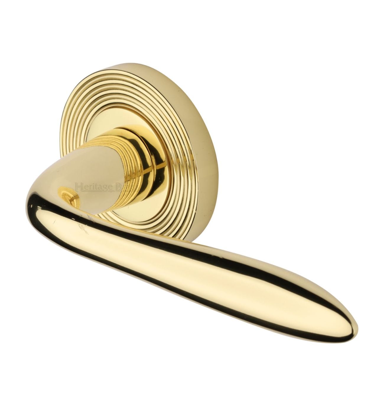 Heritage Brass Door Handle Lever Latch on Round Rose Sutton Reeded Design Polished Brass finish UK Registered Design Number 6204750